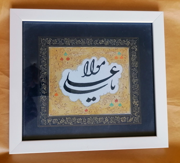 این طرح با مرکب و گواش پنتل اجرا گردیده و تماما ههر خوشنویسی و تذهیب با دست اجرا گردیده است .قاب این تصویر سفید رنگ انتخاب شده که زیبایی طرح و نوشته را چند رابر میکند .