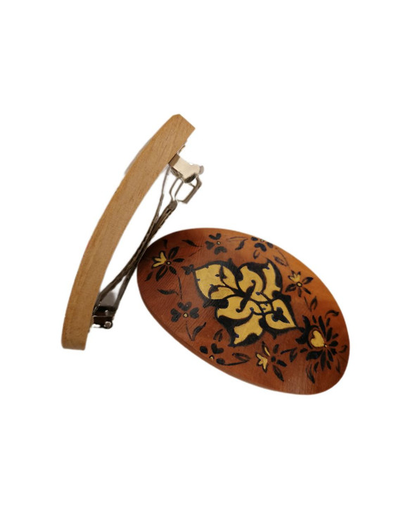 گیره سر یا موگیر که از چوب با طرح زیبای نقاشی ایرانی به صورت اسلیمی و بداهه های ختایی به رنگ لاجورد ایرانی تولید شده است. طراحی و اجرای این طرح با گواش پنتل و با دست میباشد.در صورت موجود نبودن قابل سفارش مجدد میباشد.